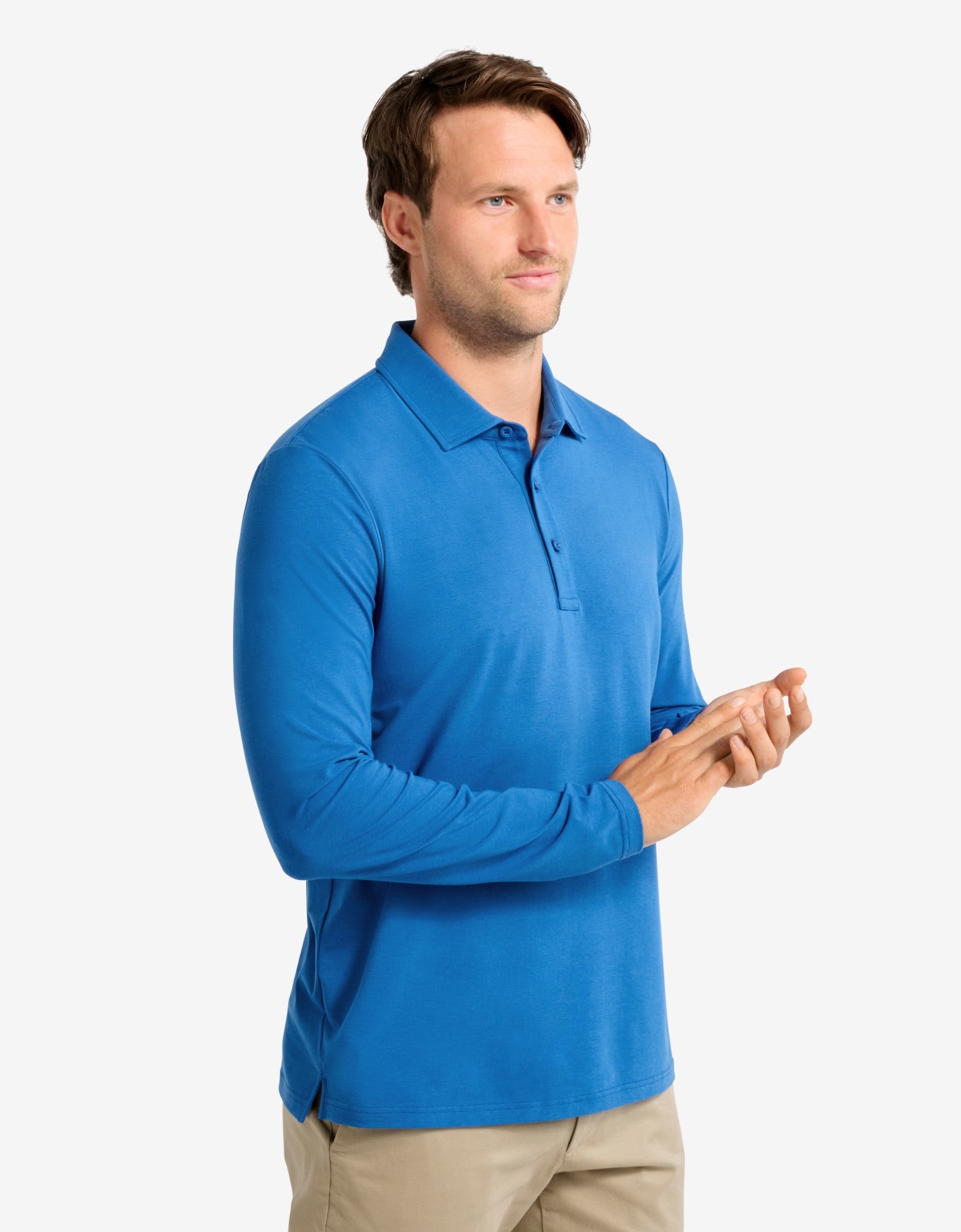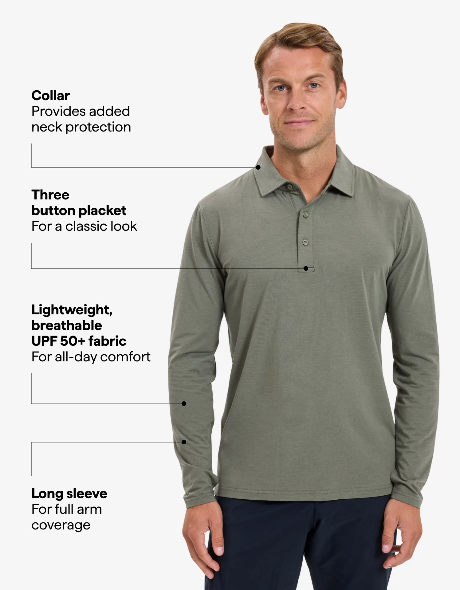 Our UPF 50+ Long Sleeve Sun Protective Polo Shirt for Men is made from a soft, natural cotton-bamboo blend that’s breathable, anti-odour, and gentle on the skin. Recommended for sensitive skin, it’s ideal for long days in the sun, including playing golf, walking, travel, and leisure.