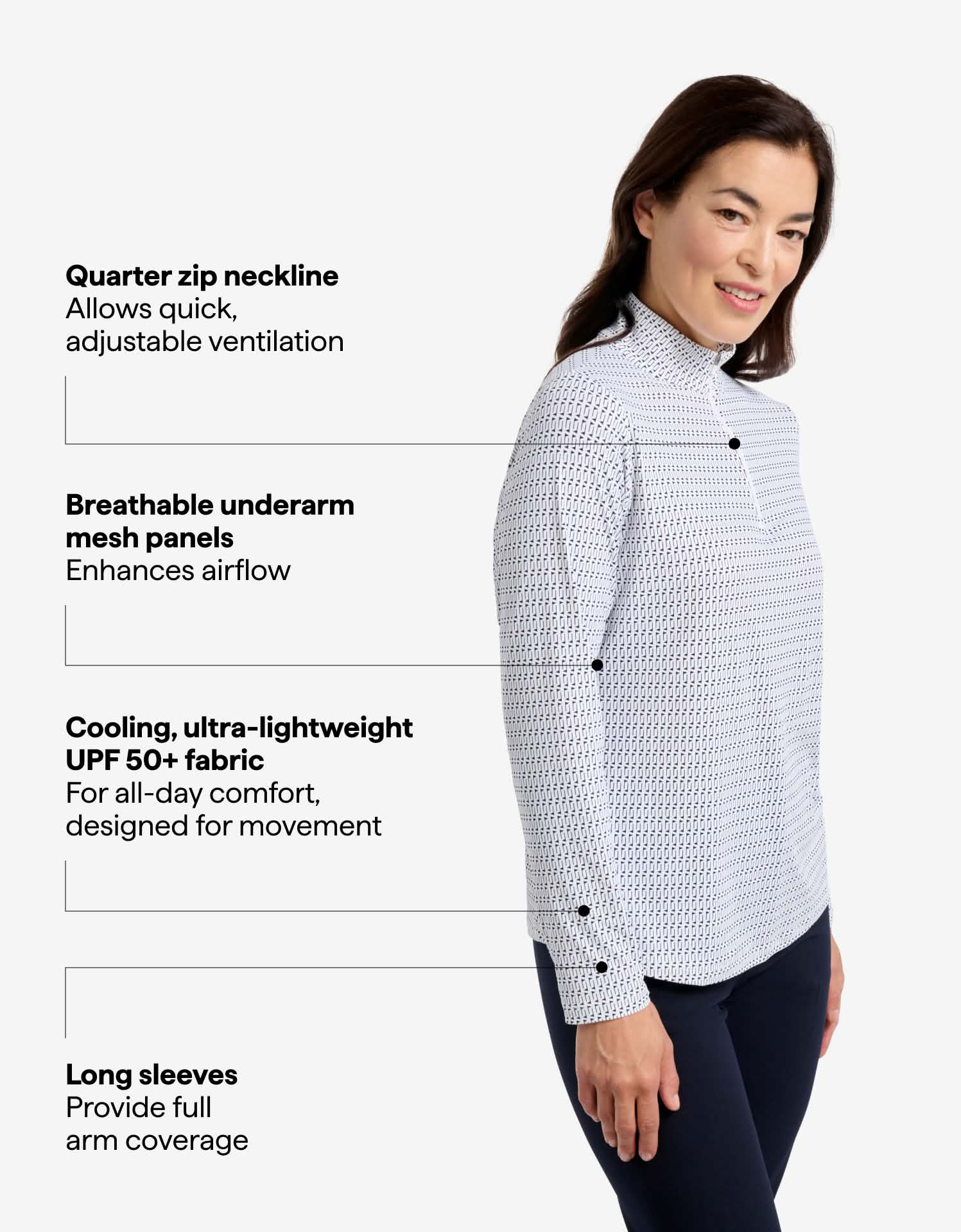 Made from our Keep Your Cool UPF 50+ fabric, it offers breathable comfort and superior sun protection. Mesh underarm panels enhance airflow, while the mock neck and long sleeves extend coverage. The quarter-zip neckline allows easy ventilation, perfect from tee to clubhouse.