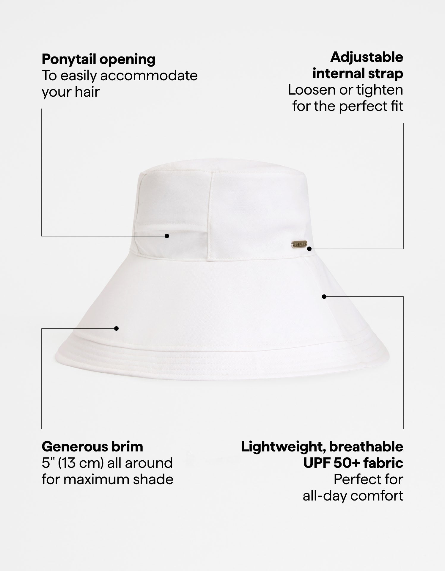 Take the shade with you in our stylish Summer Ultra Wide Brim Sun Hat. The generous 5" (13 cm) brim, crafted from certified UPF 50+ fabric, offers excellent sun protection for your face. It's feature-packed with an adjustable internal strap for customised sizing, a removable chin strap to keep the hat secure, and a discreet ponytail opening at the back.