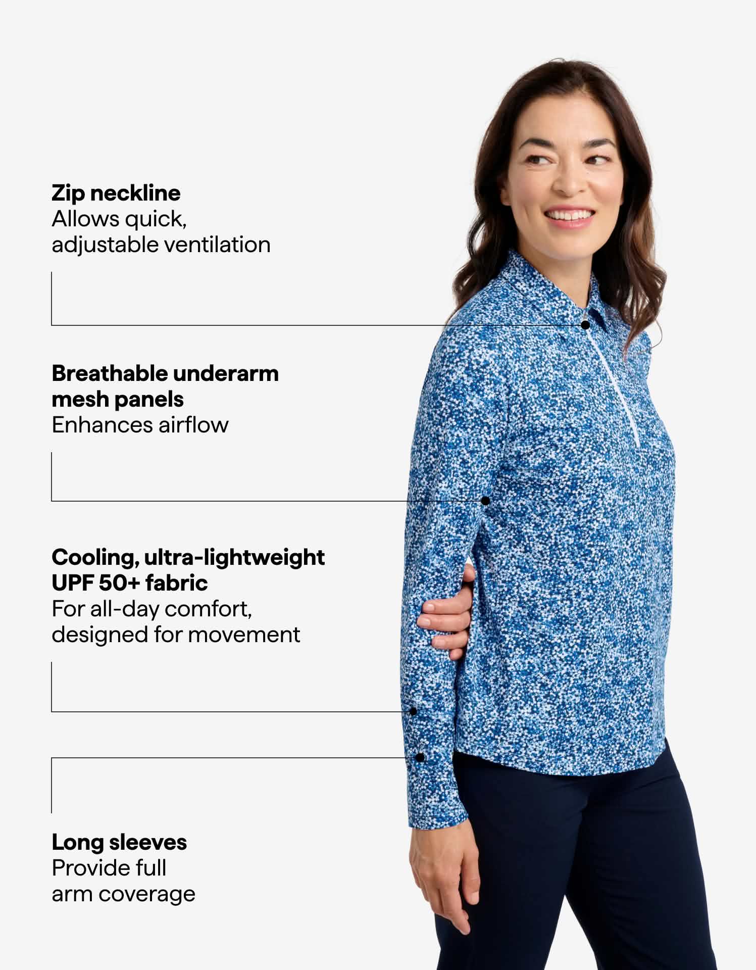 Our UPF 50+ Keep Your Cool Fabric is lightweight, cooling, soft, breathable, anti-odour and moisture-wicking, making it ideal sun protection for active days outdoors.